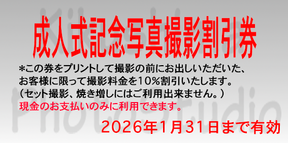 成人式のお祝いは二十歳を境に大人として認められ、さまざまな権利と義務を与えられ、大人となる喜びを自覚する慶びの日です。 皆様ご存じだと思いますが、1999年6月10日の改正祝日法(ハッピーマンデー法)により2026年の成人の日は祝日は1月12日となります。 今回のサイト更新ではWebWindowには成人式の多ポーズの見本を用意いたしました。いろんな角度から撮影しますと今までに見られない貴方の別人が潜んでいるかもしれませんよ! また割引サービス券も用意いたしましたのでお手数ですがプリントしてお持ちいただくかスマホで当サイトをご呈示下さい。ご来店を心よりお待ちしております。(・_・)(._.) ご予約お待ち致しております。<m(__)m>