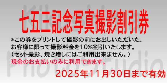 七五三は子供の成長の節目とされ、三歳、五歳、七歳のお祝いです。七、五、三は古くより縁起の良い数字とされており、それを祝って神社に参拝し子供の成長と幸福を祝う、江戸時代からの行事です。 お祝いする年齢は、今では満年齢でするのが一般的だと言われていますが、おじいちゃん、おばあちゃんがいらっしゃるお宅では、お祝いは、はやく数えでとおっしゃるそうです。 要はその家のご都合で宜しいのではと思います。 写真は上のメニューでWebWindowのタブをクリックして下さい。 そこで、今年七五三のお祝いをご予定のお父様お母様で、当スタジオでわが子の晴れ姿を写真に残しておいて上げたいとお考えの皆様にささやかながら、撮影割引券を用意いたしまし。ご面倒でしょうが、下の券をプリントアウトして撮影の前にお出しください。裏にメールアドレスをお書きください。 有効期限は11月30日迄です。 ご予約お待ち致しております。<m(__)m>